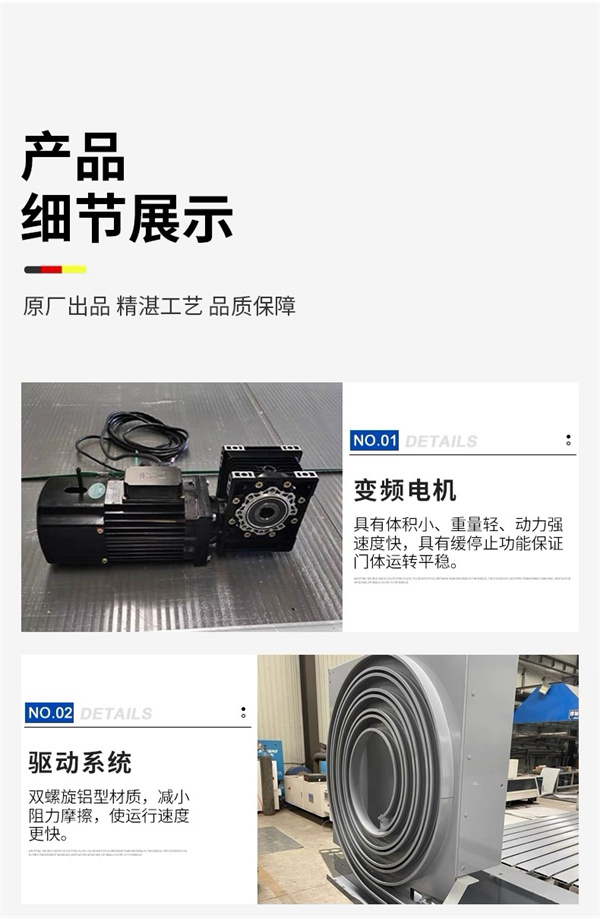涡轮硬质快速门依靠电机驱动,通过独特的涡轮式卷轴带动硬质门板快速升降,运行时,门板两侧的滑轮在阿基米德螺旋线形状的涡轮轨道内滚动,这种轨道系统不仅为门板提供导向和稳定支撑,还能有效减少摩擦,实现高速、平稳的启闭,运行噪音很低 。